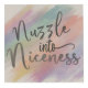 Le design présente le texte "Nuzzle into Niceful" dans une police joueuse, manuscrite, entourée de formes colorées et fantaisistes nuages et étoiles. Le design d'ensemble dégage un sentiment de chaleur, de confort et de positivité, invitant le porteur à embrasser la gentillesse et à trouver de la joie dans des plaisirs simples.
