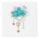 Clé d'or antique aux roses turquoise tendance décorée de feuilles d'or blanc et de perles rose et bleu. Couleur tendance. Rose turquoise. Blanc doré. Tiffany bleu.
