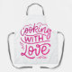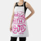 Cette conception d'tablier présente l'expression chaleureuse "Cuisine avec amour" dans une typographie élégante, accentuée par de charmants graphismes sur le thème de la cuisine. Un choix parfait pour les cuisiniers passionnés, il ajoute chaleur et personnalité à vos aventures culinaires.
