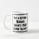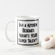Drôle slogan sur une tasse qui dit "Je suis un concepteur de cuisine. Quel est VOTRE super talent ?" Mug pour un concepteur de cuisine. Texte en gras noir et blanc.