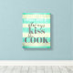 Cette peinture murale de cuisine est sur toile étirée avec une mignonne citation humoristique toujours baiser le cuisinier sur rayures bleues et grises en détresse. OEuvre murale pour décoration de cuisine.