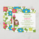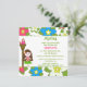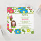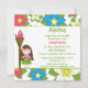 Cette invitation de fête d'anniversaire de 5,25 x 5,25 a un design tropical luau hula girl. Le arrière - plan est rempli de fleurs roses, bleues et blanches. Il y a une coiffeuse brune debout à côté d'une torche tiki. Vous pouvez facilement customiser les informations de votre parti à droite.