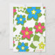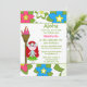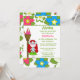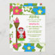 Cette invitation pour la fête d'anniversaire de 5x7 a un design tropical luau hula girl. Le arrière - plan est rempli de fleurs roses, bleues et blanches. Il y a une coiffeuse rouge debout à côté d'une torche tiki. Vous pouvez facilement customiser les informations de votre parti à droite.