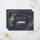 Moderne et branché, ce design RSVP faire-part de mariage présente une géométrie en or imitation cuivre ornée de verdure à l'eucalyptus aquarelle, sur arrière - plan bleu marine, avec "RSVP" dans une couleur dorée à la cuivre assortie. C'est la formule sans repas. Fait partie d'un ensemble de mariages correspondant. Copyright Invitations élégants. Tous droits réservés.