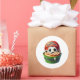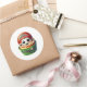 Round sticker is shown with a cute cupcake birthday soccer ball print.