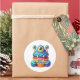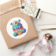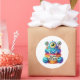 Round sticker is shown with a cute cupcake birthday blue monster print.