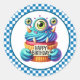 Round sticker is shown with a cute cupcake birthday blue monster print.