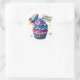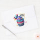 Round sticker is shown with a cute cupcake birthday space rocket print.