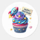 Round sticker is shown with a cute cupcake birthday space rocket print.