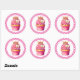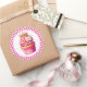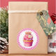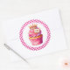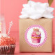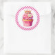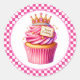 Round sticker is shown with a cute cupcake birthday princess crown print.