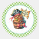 Round sticker is shown with a cute cupcake birthday pirate print.