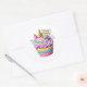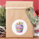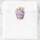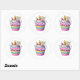 Round sticker is shown with a cute cupcake birthday unicorn print.