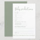 Designed with a soft green accent color, minimalist aesthetic and clean layout, this card is easy to read, simple to fill out, and perfect for modern baby shower themes. It includes prompts for birth predictions, baby features, and heartfelt messages for mom and dad.