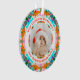 Custom Pretty Circular Family First Christmas Photo Gift Hanging Ornament. In festive colors of orange, teal green, and turquoise. A bold, round border surrounds the picture in the middle. Replace the photo with a picture of your own beautiful new baby boy or girl, family member, couple, or best friend. Personalize this by changing the words and picture. Give as a present for family at Christmas. Mama, mom, mam, mammy, mommy, mother, and your wife will love hanging up this gift decoration to celebrate the birth of their new baby and their first Christmas. In a lovely mixture of bright and merry colours.