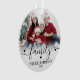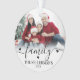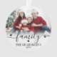 Family Christmas Photo Ornament. Celebrate the joy of the season with this elegant, custom acrylic ornament featuring your favorite photos. The front displays the word “family” in flowing script across the top, with your family name below in a timeless serif font for a personal touch. The back includes space for a second photo, perfect for another favorite memory or festive moment. Soft white ombre details and customizable font and accent colors make this keepsake ornament a warm, classic addition to your holiday decor.