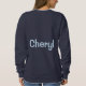 This is a Navy Blue Women's Basic Sweatshirt. The navy blue sweatshirt is customized with a woman's name, Cheryl. The name is a Chambray Comfort Color light blue color. The name Cheryl is on the front and back of the sweatshirt. You can replace the name by clicking the Personalize link. The sweatshirt fits true to size. The sweatshirt is a cotton polyester blend. The sweatshirt has set-in sleeves and double-needle stitched neckline, armholes and bottom band for long-term durability. The fabric is imported. The fabric care instructions are machine wash cold and tumble dry low.