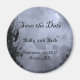 A custom magnet with Save the Date in black grungy script and room for the bride and groom names, date and location in black gothic letters against a spooky Halloween sky with misty trees along a dark haunted road, ravens and a cloudy full moon with a blue tint.