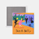 This Customizable Retro Urban Rooftop Party Magnet is intoxicating in its detail. The cartoon design features the type of wildly sophisticated cocktail party that is normally only seen in movies from the 1960s. There is a lot for the partygoers to take in. From the comfort of a penthouse apartment, guests are enjoying the view and the ambiance. The lighting sets the mood and we are able to see the darkened silhouettes of an attractive couple dancing the cha-cha. On the floor, there is a purple, portable, record player at the feet of the dancing couple. Several albums have been scattered nearby. Even with the dimmed lighting that makes practically everything in the room appear in shades of purple, blue and black, we can tell that everyone is dressed to the nines. Behind the dancing, indoor couple, there is a gentleman in a black suit holding a martini glass. He is talking to a dark haired beauty who is standing near one of the floor to ceiling glass walls. From a lampstand, a single bulb is casting a romantic glow on the scene. The only thing missing is the lampshade. Hmm... Where is the shade? It's on the head of a tipsy man who has taken the party outside to the orange rooftop. He's clearly got some fine dance moves and he isn't afraid to show them to the world! His companion is a shapely, blonde woman in a bright pink dress. Her back is arched as she throws back her martini in an uninhibited fashion. Beyond the party, there is a breathtaking teal skyline, complete with skyscrapers and a purple sky. If this is how the other half lives, sign me up! Personalize this magnet for a one of a kind gift.