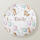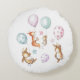 Décoré avec les motifs originaux super mignons de Kate Garrett, ce coussin doux ferait un joli ajout à la pépinière d'une petite fille. Des petits lapins, des souris et des écureuils se balancent de beaux ballons roses, mauves et vert menthe. Personnalisé avec un nom, cela fait un super cadeau pour un nouveau-né, ou un cadeau baby shower.