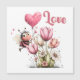 Embrace the sweetness of love with this charming design featuring an adorable bee holding a pink heart balloon, a beautiful bouquet of pink tulips and delicate daisies. The word 'Love' is elegantly scripted. Ideal for Valentine's Day, anniversaries, or just to show someone special you care.