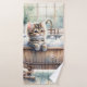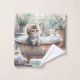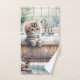 Une jolie aquarelle illustrant l'adorable chaton qui profite d'un bain à bulles dans une baignoire en bois rustique, avec un décor serein de plantes et une lumière naturelle douce filtrant par une fenêtre.