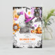 L'invitation présente un adorable chat portant un casquette sorcier violet, entouré de divers symboles d'Halloween comme les araignées, les chauves-souris et les citrouilles de jack o'lanterne. En plus du thème éffrayant, le dos de la carte d'invitation est orné d'un motif de chats.