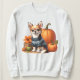 L'adorable Chihuahua, au milieu de décorations d'automne vibrantes, avec des fleurs citrouilles et oranges de saison, habillé chaleureusement dans un chandail tricoté élégant, parfait pour les thèmes d'automne ou des concepts de saison douillets.