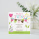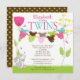 Commencez votre baby shower jumeau directement avec nos lignes de vêtements pour bébé lignes baby shower invitation pour une combinaison de naissance jumelle garçon fille jumeau. Notre invitation à baby shower multiple pour un jumeau fille & garçon comporte un mignon lapin assis sur une pelouse avec des fleurs roses et jaunes avec deux étoffes avec des costumes de bébé bleus, roses, verts citron et marron. Coordonner les pois bruns et verts citron. Visitez notre boutique pour obtenir les cartes de remerciement, les autocollants et les timbres-poste Les maillots de bain sont © Erin Bradley Designs