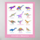 12 Dinosaurs in colorful psychedelic bright colors with their dino names, the perfect educational design for the girl who loves dinosaurs. pink and white boarder with personalized name plate. This fun palaeontology pattern includes all the prehistoric jurassic era favourites including T. rex or tyrannosaurus, velociraptors, brachiosaurus, brontosaurus, stegosaurus, the flying pterodactyl, triceratops, spinosaurus, ankylosaurus, plesiosaurs, parasaurolophus and pachycephalosaurus a fun spelling challenge for any child.