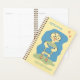 An adorable school planner for kids featuring a whimsical yellow duck carrying a blue book on the front and a yellow and green stripe pattern on the back . Personalize it with the child's name and the academic year . Pick a size .