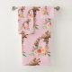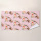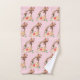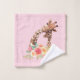 Serviette avec un joli dessin en aquarelles d'une maman et d'une petite girafe. La girafe mère se repose la tête au-dessus de la petite girafe, aimante et adorable. Joli bouquet de fleurs d'aquarelle rose, jaune, vert placé sous cette paire de chatons. Arrière - plan rose clair.