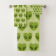 Adorable pattern of cute heart-shaped alien heads in soft green tones on a bath towel set perfect for adding a whimsical touch to your bathroom decor. This design makes a fun gift for sci-fi lovers and alien enthusiasts. Edit to change the background to any color you wish. ♡ Idyllfire