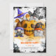 Cette invitation pour la fête des enfants présente quatre gnomes d'Halloween et un jack o'lanterne en forme de coeur. En plus du thème éffrayant, il y a aussi un arbre et des croix grises. Il y a une bordure noire grunge autour. Le dos comprend un motif gnome.