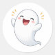Adorable white cartoon ghost character laughing joyfully with a big smile, rosy cheeks, and raised arms on a dark background. This cute and friendly ghost illustration has a playful, non-scary look, perfect for kids designs, stickers, emojis, Halloween graphics, T-shirts, posters, apps, and digital art. Ideal for themes of fun, happiness, cartoons, cute characters, friendly ghosts, humor, celebration, and cheerful spooky design.