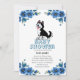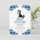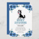 This baby shower invitation features a thematic, professional layout designed with a balanced blue and white color palette. The aesthetic combines traditional floral elements with a playful, illustrated mascot a stylized husky puppy positioned at the center to establish a warm, welcoming tone.