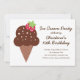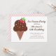 Un cône de crème glacée au chocolat moderne et mignon avec des arroses et une fraise rouge sur un arrière - plan blanc immaculé. Retournez notre amusant invitation d'anniversaire de piscine d'été pour trouver une bande rose pour une touche spéciale supplémentaire.