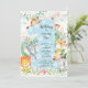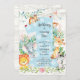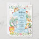 Cute Jungle Big One Boys Birthday Invitation avec un grand numéro bleu entouré d'animaux safari, singe, girafe, lion, éléphant & zèbre sur un arrière - plan populaire en bois blanc.