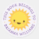 Étiquettes de livres mignons ou autocollants de bibliothèque avec un joyeux soleil de style kawaii sur un arrière - plan violet pâle. Texte mauve personnalisable : "Ce livre appartient à" et votre nom personnalisé. Idéal pour étiqueter les livres scolaires et votre bibliothèque personnelle ou familiale