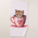 Serviette sertie d'un mignon petit chaton. Assis dans une tasse à l'air positivement adorable. Une petite patte est suspendue au bord. Les coeurs tourbillonnent tout autour. Doux et fantaisiste.