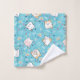 Serviette sertie d'un mignon motif de chat, posée sur un arrière - plan bleu et décorée d'arcs-en-ciel et d'empreintes de pattes et plus encore.