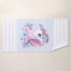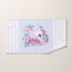 Serviette sertie d'une adorable image d'un doux portrait de tête de licorne de bébé. Un petit papillon qui visite, floutant près de son nez. Un bouquet de fleurs autour de son cou complètent ce design très mignon.