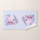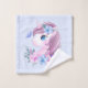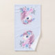 Serviette sertie d'une adorable image d'un doux portrait de tête de licorne de bébé. Un petit papillon qui visite, floutant près de son nez. Un bouquet de fleurs autour de son cou complètent ce design très mignon.