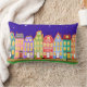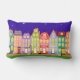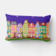 Mignonne ville de nuit à pied Coussin de chat. Idéal pour la crèche ou la chambre des enfants. Mignonnes maisons de dessin animé, réverbères, ciel nocturne étoilé, et chat noir marchant dans la rue. Coloré et amusant : bleu, vert, bleu clair, orange, rose, jaune.