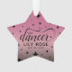 Une étoile est née ! Célébrez cette nouvelle bande de joie de la première année avec ce ornement de Noël, qui comporte les mots "minuscule danseur", mis en script fluide élégant sur un motif répétitif d'étoiles, proche et lointain, scintillant contre un arrière - plan rose rose de thé en transition vers le gris. Reverse affiche un design identique. Personnalisez avec le nom du bébé et la date de naissance. Design © W.H. Sim, Tous droits réservés. Voir plus sur zazzle.com/expressionsoccasions