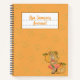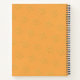 The spiral notebook design has the "Tangy Orange" diagonal pattern on an orange background on both the front and back. The artist's orange chibi character is located at the bottom right of the front cover, which also features a white box with brown borders with the owner's name and journal writing inside. The dashes give the box a notebook appearance.