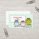 Une jolie famille de chouettes sur un arrière - plan de pois vert clair forment l'image principale de ce design carte de visite particulièrement adapté aux tuteurs ou aux entreprises d'enfants. Customisez-le avec votre propre nom et contact.