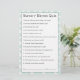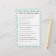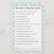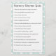 Une idée mignonne comme un jeu de baby shower, ce jeu de questions et réponses présente des questions bien-aimées de rime de pépinière. Chaque client reçoit une fiche de jeu et remplit ses réponses. Une fois les réponses complétées, l'hôte ou l'interlocuteur du jeu appelle les questions et fournit les réponses correctes. L'invité avec les réponses les plus correctes gagne un prix! Ce design a un adorable ours de panda sur le dos de la carte de jeu et utilise le thème de coordination de l'aqua et beige d'ivoire pour assortir une collection de produits baby showers dans ce thème sexy neutre. Voici les réponses aux questions sur la carte de jeu : 1. Tarte de Noël. 2. quatre et vingt. 3. un morceau de poivrons marinés. 4. boucher, boulanger, bougeoir. 5. pleine de grâce. 6. un poney. 7. pour aller chercher un seau d'eau. 8. les embrassèrent. 9. la femme de l'agriculteur. 10. un os. 11. son souper. 12. un piéman. 13. cloches en argent, roulettes de coques, jolies domestiques toutes dans une rangée. 14. un porc