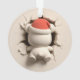 This delightful, double-sided ornament showcases an adorable 3D polar bear. The front features it peeking from a cracked opening, radiating holiday cheer with its red Santa hat and sweet expression. The back complements, showing the polar bear from behind. This charming piece offers a full festive view, perfect for your holiday tree.