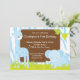 Commencez votre fête anniversaire de enfant safari dans la jungle avec notre invitation anniversaire de enfant d'animaux de safari dans la jungle douce avec la girafe la plus mignonne et l'éléphant sur un arrière - plan marron avec une bordure zébrée bleue et blanche. Le fond de notre invitation est assorti d'un arrière - plan de couleur bleue. Mignonne pour une première fête d'anniversaire de garçon. Visitez notre boutique pour voir d'autres invitations à la fête d'anniversaire mignonnes et des notes de remerciements assorties, des autocollants et des timbres-poste. © Babystar Designs