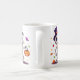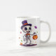 This adorable Halloween mug features a cheerful cartoon skeleton with big, friendly eyes, rosy cheeks, and a happy smile. Wearing a purple top hat with an orange band and bow tie, the skeleton holds a jack-o'-lantern candy bucket surrounded by floating candies, apples, and orange starbursts. Perfect for hot cocoa, coffee, or tea during spooky season, this cute design adds a fun and festive touch to your mornings. Makes a great Halloween gift for friends, coworkers, or family!